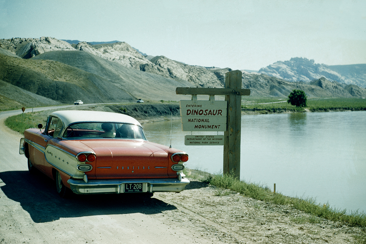 This photograph, taken in 1958 at the entrance to the Dinosaur National Monument, is an ode to the great American outdoors and the spirit of the road trip. A majestic 1958 Pontiac Star Chief, recognizable by its elegant lines and chrome ornaments characteristic of the era, takes center stage. The composition is highlighted by the wooden sign marking the park’s entrance, while the arid mountains and the shimmering lake provide a stunning and wild backdrop.
