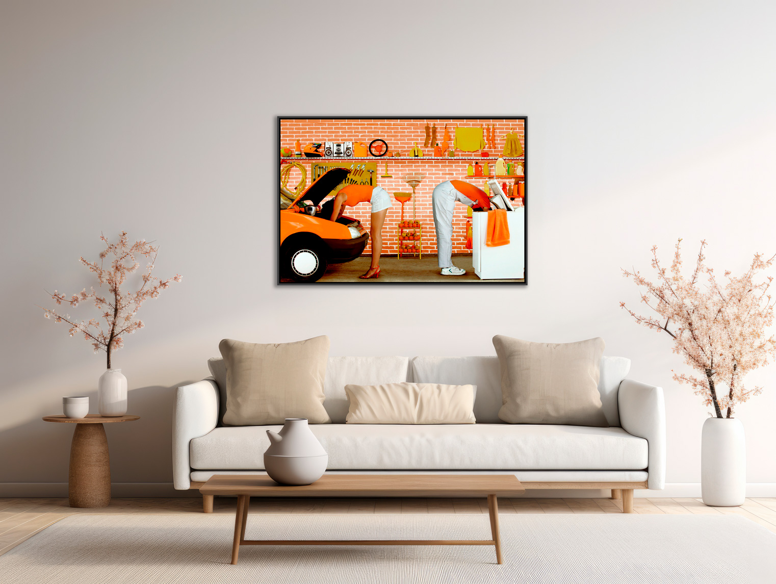 This photograph by Dingo, true to his characteristic style that combines humor, surrealism and a touch of elegance, features an unexpected juxtaposition between mechanics and domestic chores. In a setting dominated entirely by shades of orange, a woman and a man bend over simultaneously, each absorbed in an opposite but strangely parallel task: the woman is immersed in the hood of a car, while the man is bent over the drum of a washing machine. The meticulously arranged set features a brick wall where every object is carefully colored to harmonize with the dominant orange palette: tools, accessories, hanging clothes, even fruit and cleaning products. This attention to chromatic detail creates a coherent and pleasing visual effect, reinforcing the ordered absurdity of the scene. Here, Dingo plays with gender stereotypes by reversing traditional roles, while placing them side by side in a familiar yet resolutely offbeat setting. His idea for this photograph was inspired by the arrival of women in previously male-dominated positions in the automotive industry. With his usual audacity and no-holds-barred approach, he celebrates this societal evolution by creating an image that not only breaks codes, but also feeds the eye and the heart. Dingo has never hesitated to shake up conventions and reinvent visual narratives, bringing a subtle poetry to every image he composes.