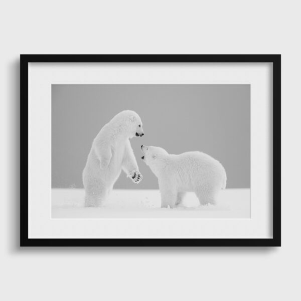 Two polar bears confront each other in a pristine world.One, majestically erect on his hind legs, adopts a posture of intimidation, seeking to impress his adversary.The other remains on all fours, mouth gaping, ready to react. Snowflakes swirl around them, marking the dynamism and energy of their recent movements. The uniform whiteness of the background creates a visual harmony, highlighting the power and grace of these Arctic creatures.