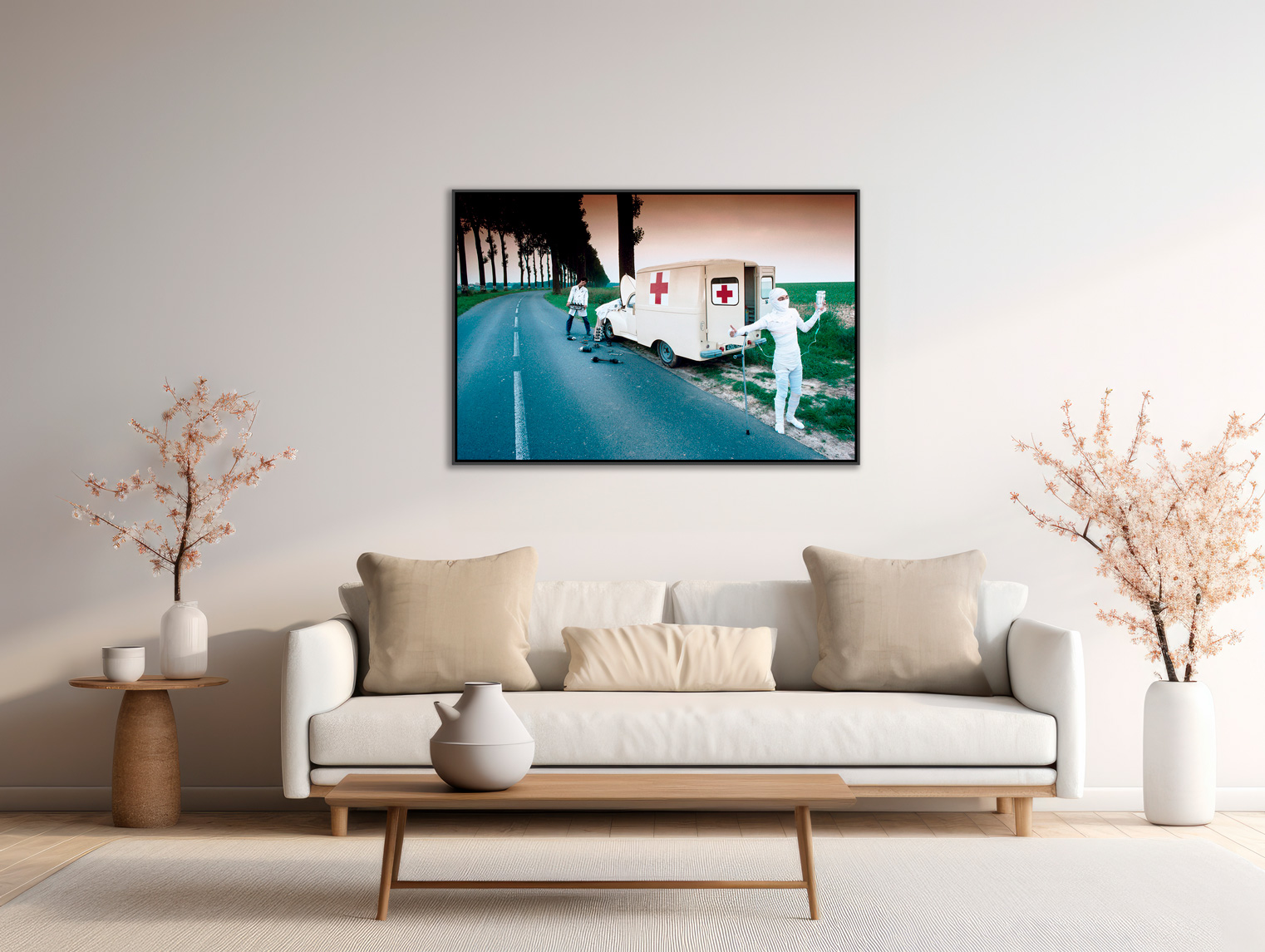 This photo perfectly illustrates the facetious, surreal spirit of photographer Dingo, whose work transforms the banalities of everyday life into humorous, unexpected scenes. Here, the image plunges us into an absurd scenario: a broken-down ambulance on a deserted road, surrounded by scattered engine parts, evoking a medical procedure transformed into a clumsy car repair. The nurses, absorbed in repairing their ambulance ‘s engine, have left their patient in the lurch, who, fully bandaged like a mummy, takes the surprising initiative of hitching a ride, drip in hand, ready to continue his journey in an unconventional manner. Here, Goofy plays with the viewer’s expectations, capturing a scene that straddles the border between dream and reality, where the absurd takes over to transform the ordinary into the extraordinary, while maintaining a light, joyful tone that leaves a lasting imprint of good humor. For the record, this shoot was organized by Dingo with an impressive deployment of equipment and spotlights, lighting up the stage in spectacular fashion. The installation was so visible that it was impossible not to realize that it was a photo shoot. Yet, despite this obvious paraphernalia, some passing motorists, totally absorbed by the scene, actually stopped to offer their help and accompany the fake casualty to hospital, thinking they were witnessing a real emergency. This unexpected reaction from passers-by underlines the extent to which Dingo manages to blur the line between fiction and reality, creating tableaux so convincing that even direct witnesses are drawn into his whimsical world. This anecdote reveals the magic of Dingo’s work: his ability to capture attention through humor and the unexpected, while telling stories that, however improbable, resonate deeply with human reality. The intricate installation and theatrical character of the scene testify to Dingo ‘s commitment to creating not just an image, but a living, interactive experience, where the viewer becomes, sometimes in spite of himself, a participant in the absurdity orchestrated by the artist.