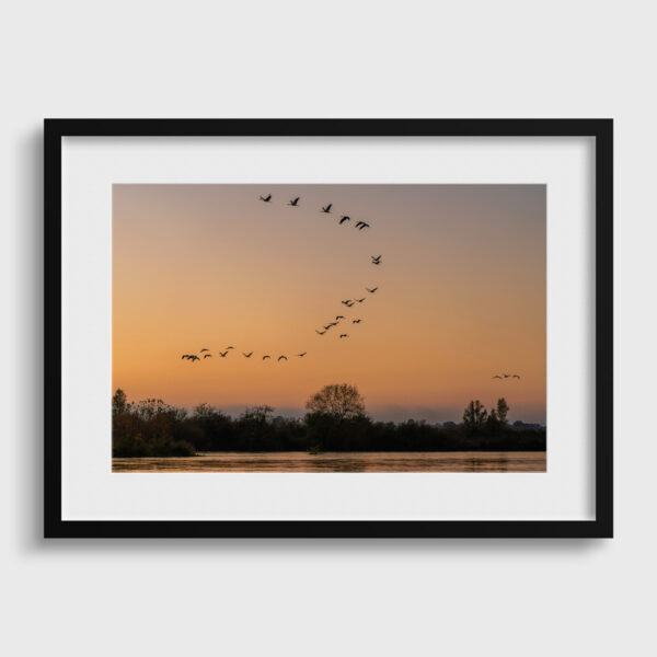 Under a sky awash with golden and orange hues, the cranes take flight above the river, tracing harmonious formations in an aerial ballet. The soft dawn light reveals the contours of the surrounding nature, while the silhouettes of the birds in motion convey both their power and lightness. An invitation to contemplate the perfect order of nature.