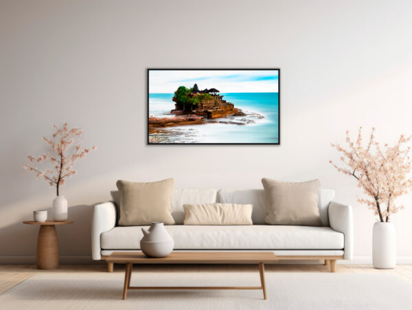 The splendor and sacredness of Bali’s Tanah Lot temple harmonizes elegantly with the natural elements that surround it.Perched on a rocky islet majestically overlooking the sea, the temple stands like a precious treasure, bearing witness to the deep piety of the Balinese towards their Hindu religion and traditions.The striking contrast between the sea, whose waters seem imbued with a hazy, dreamlike softness, and the rough, ancient stone of the temple, creates a spellbinding visual composition.This captivating canvas of history and nature reveals a perfect symbiosis, inspiring wonder and contemplation.The legend surrounding the temple’s creation, fervently recounted by local inhabitants, lends the site a mystical aura, reinforcing its charm and sacred character.