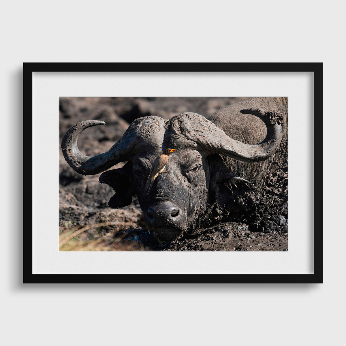 African buffalo (Syncerus caffer) If mud doesn’t bother the buffalo, it’s not a tiny red-billed oxpecker that will. The buffalo covers itself in mud to get rid of ticks and parasites, and the oxpecker helps it in its quest.