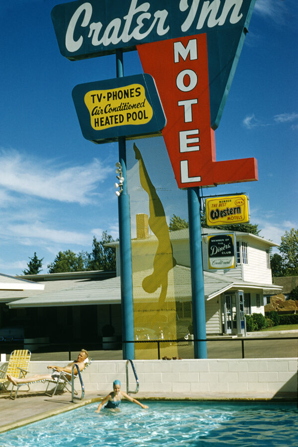 In the background, the motel buildings, with their functional architecture and immaculate cleanliness, add a touch of realism to this everyday scene. Signs advertising affiliations with “Best Western Motels” and “Diner’s Club” underscore the growing importance of brand recognition and uniformity in 1960s America.