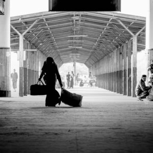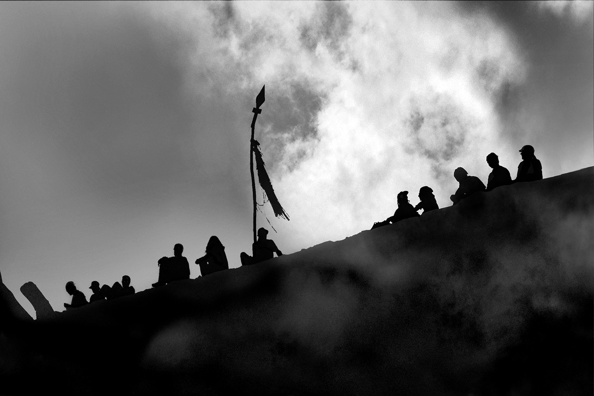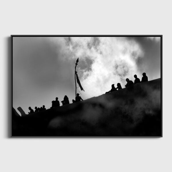 Bien que la photo semble banale à première vue, elle capture l’ampleur de l’événement, montrant des individus rassemblés même sur les arêtes des collines environnantes. Les silhouettes sombres des personnes se détachent contre un ciel lumineux, illustrant la patience et la dévotion des participants.