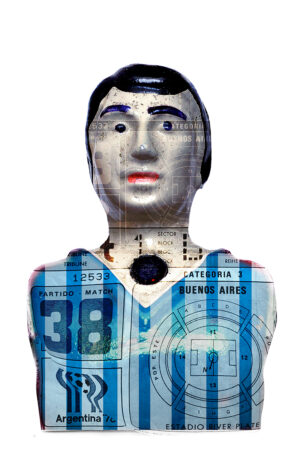Cette figurine de babyfoot, au nom évoquant possiblement un joueur ou faisant référence à l’univers du football, est représentée comme une sculpture iconique. Le joueur de babyfoot est vêtu d’un maillot imaginaire, détail d’un billet de match au pouvoir évocateur fort, au graphisme d’une autre époque convoquant ainsi les souvenirs d’un passé révolu.
