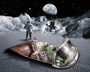 Les volutes de fumée qui s’échappent des pneus, la texture vieillie des carrosseries, et les tenues vintage des conducteurs renforcent l’atmosphère rétro et surréaliste de l’œuvre, transportant le spectateur dans une époque où la vitesse était synonyme d’aventure et d’élégance. Dingo parvient à capturer non seulement la beauté des voitures, mais aussi l’esprit ludique et convivial du festival, en transformant une simple course en une célébration visuelle de l’amitié et du respect mutuel.