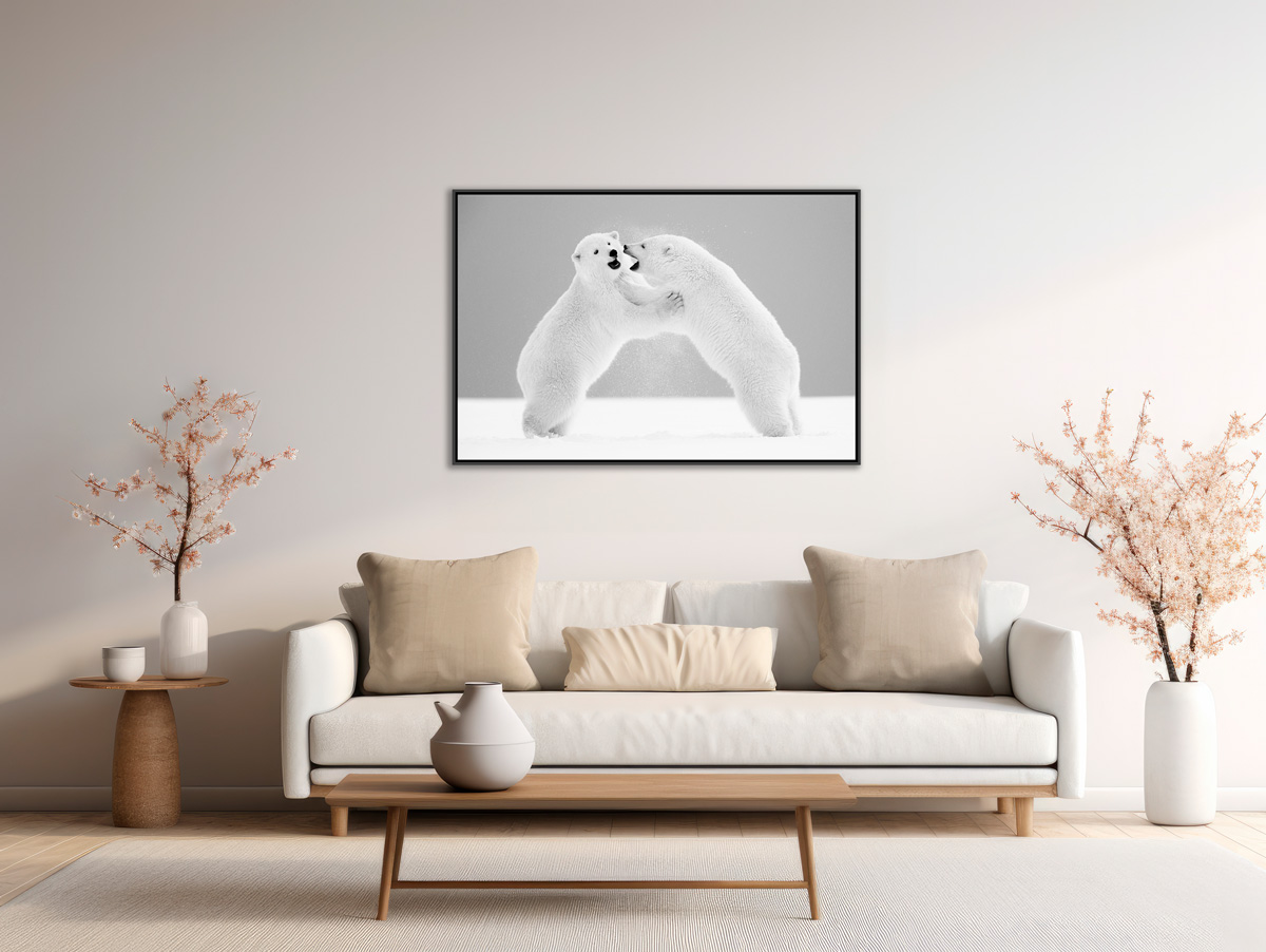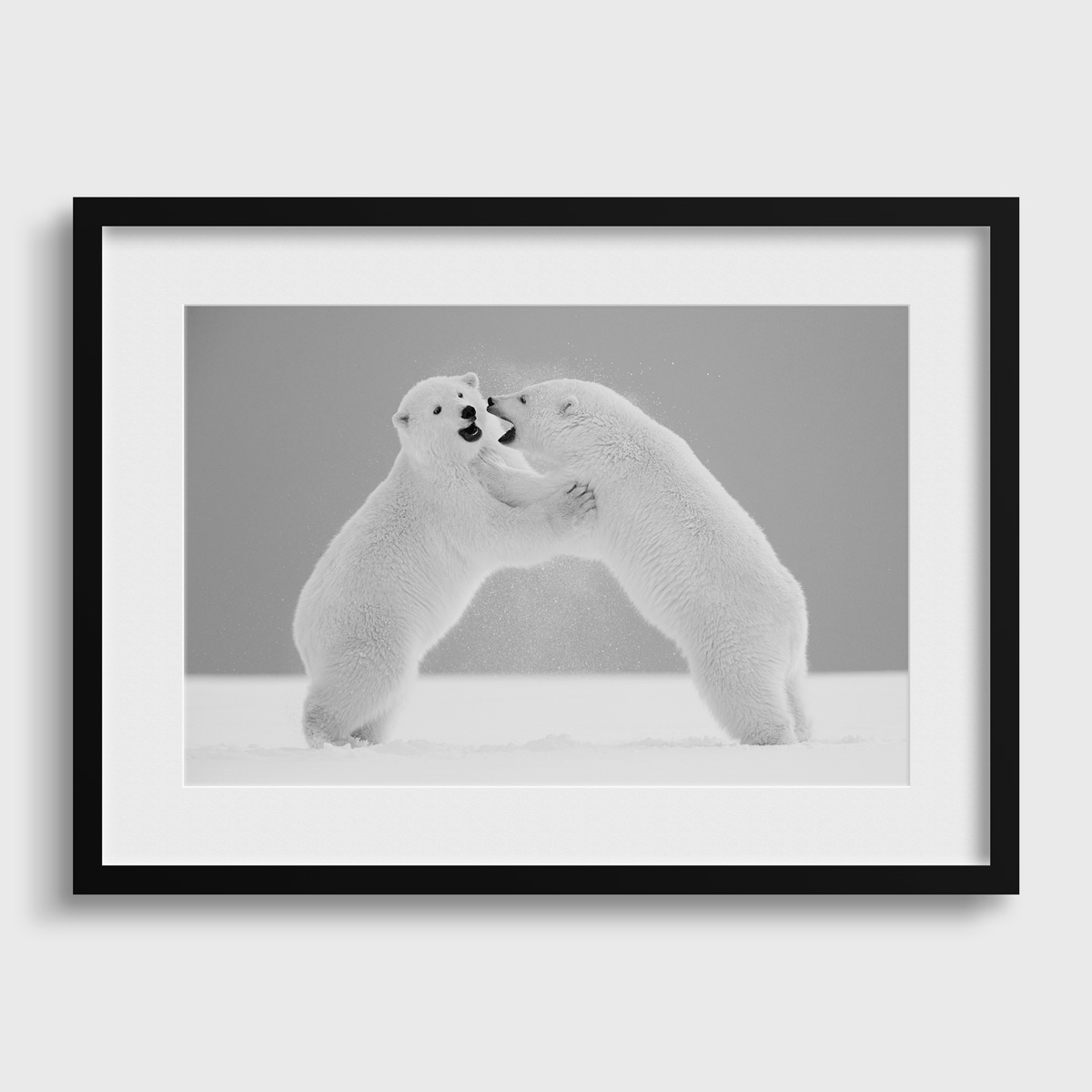 Jeu vivifiant sur la neige immaculée. Les ours, dressés sur leurs pattes arrière, se tiennent par les épaules, la gueule ouverte dans une posture à la fois combative et ludique. De fines particules de neige s’élèvent autour d’eux, ajoutant une dimension dynamique à l’image et soulignant l’énergie de la scène. L’arrière-plan uni accentue la blancheur éclatante de leur fourrure et met en lumière les détails de leur pelage épais. La composition symétrique et l’attention portée aux textures font de cette image une œuvre saisissante, illustrant à merveille l’innocence et la vigueur des jeunes ours dans leur habitat naturel.