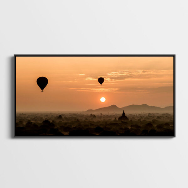 Vue extraordinaire de Bagan en Birmanie au lever du soleil. La ville, avec ses nombreux temples, stūpas et pagodes, est enveloppée d’une fine brume, ajoutant une atmosphère spirituelle supplémentaire à ce paysage sacré. Quelques montgolfières survolent paisiblement le site, se détachant contre un ciel aux teintes rose et jaune. Cette lumière douce et dorée crée un contraste magique avec les silhouettes anciennes des temples, accentuant leur beauté et mystère. La tranquillité de la scène est palpable, rendant ce moment encore plus envoûtant.