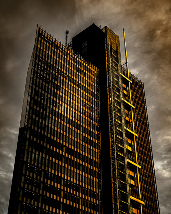 Architecture d’immeuble de bureau dans le style pop art proposée par une série d’explosion de couleurs et de contrastes. Le ciel chargé de nuages sombres crée un arrière-plan dramatique, avec une dominante de tabac et de jaune, amplifiant l’effet saisissant de la scène. L’architecture se détache nettement contre ce ciel tumultueux. Ses lignes nettes et ses formes géométriques audacieuses sont rendues encore plus dynamiques par un fort contraste avec la teinte sombre de l’édifice. Les étages se succèdent avec une régularité presque hypnotique, tandis que sur les arêtes des étages, la couleur dominante du ciel se fond et se mélange, créant un effet de fusion entre l’architecture humaine et les éléments naturels.