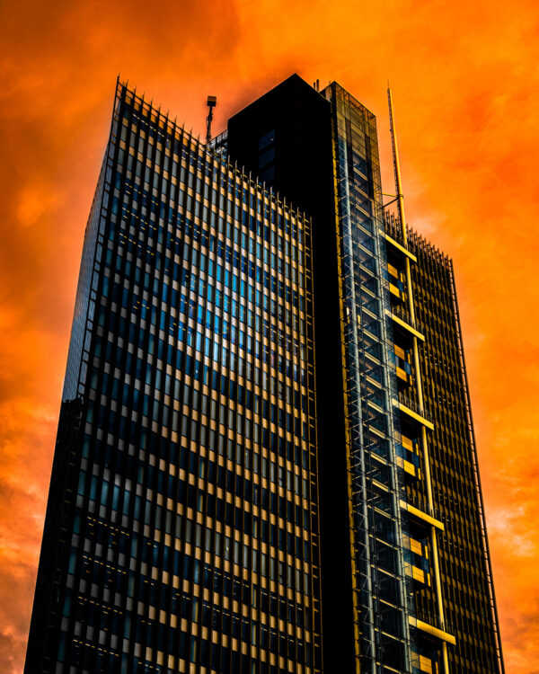 Architecture d’immeuble de bureau dans le style pop art proposée par une série d’explosion de couleurs et de contrastes. Le ciel chargé de nuages sombres crée un arrière-plan dramatique, avec une dominante de jaune orangé, amplifiant l’effet saisissant de la scène. L’architecture se détache nettement contre ce ciel tumultueux. Ses lignes nettes et ses formes géométriques audacieuses sont rendues encore plus dynamiques par un fort contraste avec la teinte sombre de l’édifice. Les étages se succèdent avec une régularité presque hypnotique, tandis que sur les arêtes des étages, la couleur dominante du ciel se fond et se mélange, créant un effet de fusion entre l’architecture humaine et les éléments naturels.
