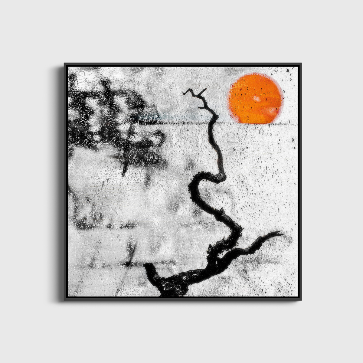 Le soleil, rond et orange, se couche, offrant une explosion de couleur vive au milieu du calme monochrome. Sa forme circulaire et sa couleur chaude créent un contraste avec le reste de la scène, introduisant un élément de dynamisme et de chaleur dans l’image. Le soleil se positionne comme une source de lumière et de vie, ajoutant une dimension de luminosité et d’énergie qui équilibre la sobriété des noirs et des blancs.