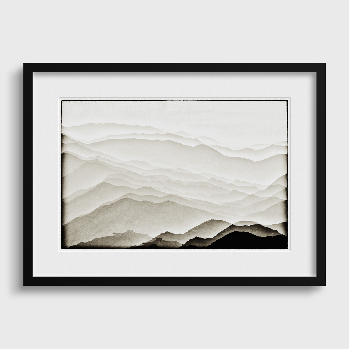 Le tirage Fine Art est posé sur un carton neutre, puis recouvert d’un passe partout blanc biseauté de 7 cm de côté et d’un verre musée, anti-reflet et anti-UV avant d’être encadré par un cadre en alu noir ou en bois (noir, blanc, chêne ou wenge).