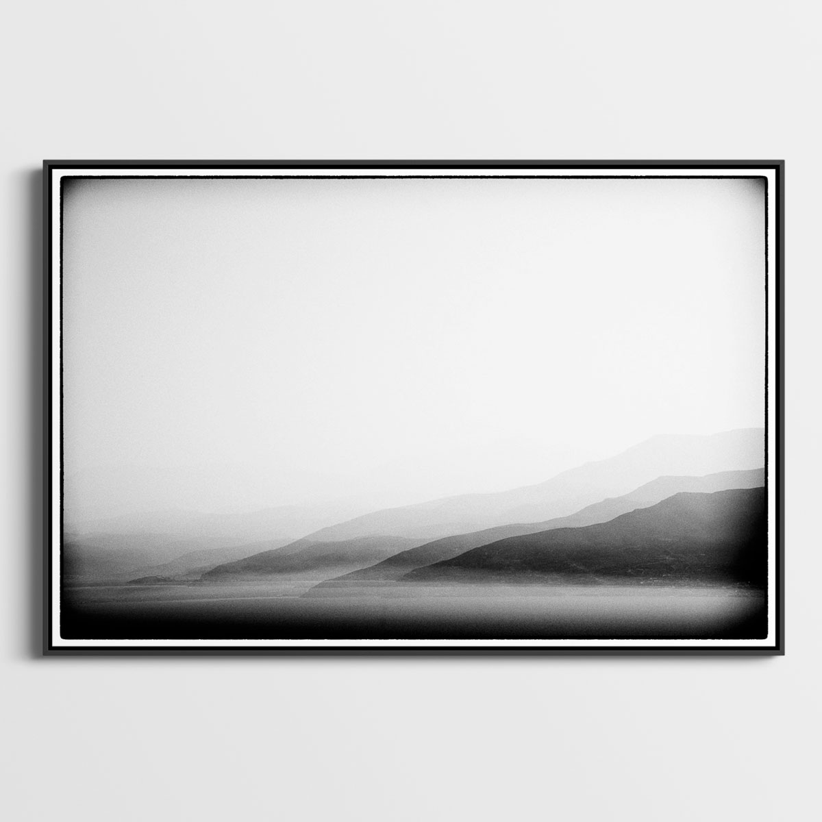 Le tirage Fine Art est posé sur un carton neutre, puis recouvert d’un passe partout blanc biseauté de 7 cm de côté et d’un verre musée, anti-reflet et anti-UV avant d’être encadré par un cadre en alu noir ou en bois (noir, blanc, chêne ou wenge).
