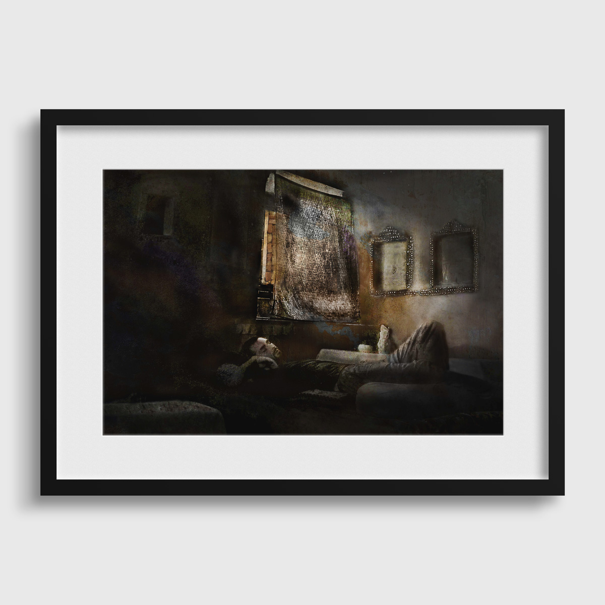 Le tirage Fine Art est posé sur un carton neutre, puis recouvert d’un passe partout blanc biseauté de 7 cm de côté et d’un verre musée, anti-reflet et anti-UV avant d’être encadré par un cadre en alu noir ou en bois (noir, blanc, chêne ou wenge).