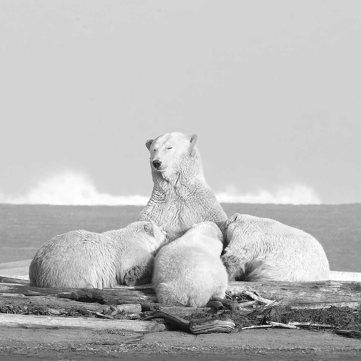 Assister à un allaitement de triplés, très rares chez les ours polaires, devant l’océan tempétueux, c’est un cadeau à apprécier à sa juste valeur.