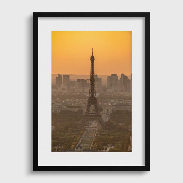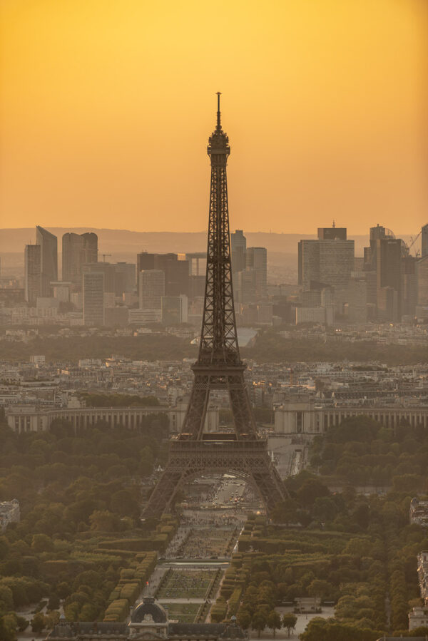 Dans cette scène capturée depuis le sommet de la Tour Montparnasse lors d’une chaude journée d’été à Paris, la lumière dorée et chaleureuse du coucher de soleil enveloppe la ville d’une aura magique. La vue panoramique offre un spectacle à couper le souffle, mettant en valeur deux des emblèmes les plus reconnaissables de Paris. Au premier plan, la silhouette emblématique de la Tour Eiffel se détache majestueusement contre le ciel orangé. Ses contours élégants se fondent harmonieusement avec les tons dorés de la lumière du soir, créant une image empreinte de grâce et de grandeur. En arrière-plan, le quartier de La Défense se profile avec ses imposantes tours, ajoutant une touche de modernité à l’horizon parisien. L’ensemble de la scène dégage une atmosphère de sérénité et de contemplation, invitant le spectateur à se perdre dans la beauté intemporelle de Paris sous la lumière dorée du crépuscule.