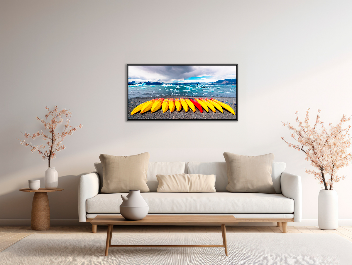Les kayaks, méticuleusement alignés, rappellent la présence humaine face à cet environnement spectaculaire et indomptable. Leurs couleurs chaudes tranchent avec la froideur ambiante, insufflant une touche de vie et d’énergie à cette scène glaciale.
